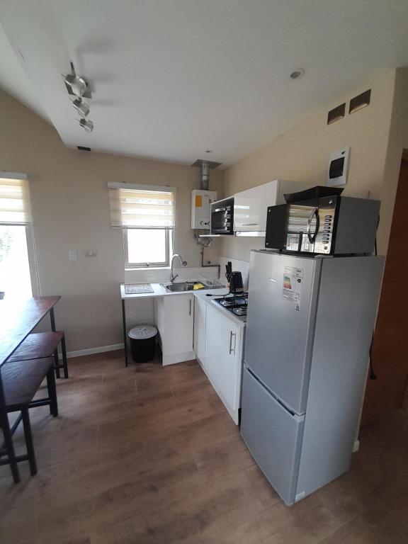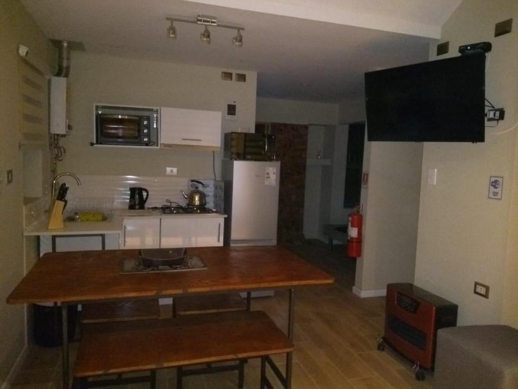 Kitchenette, Refrigerator, Microwave, Kitchen, Electric kettle, Kitchenware, Oven, Dining table, Wine glasses